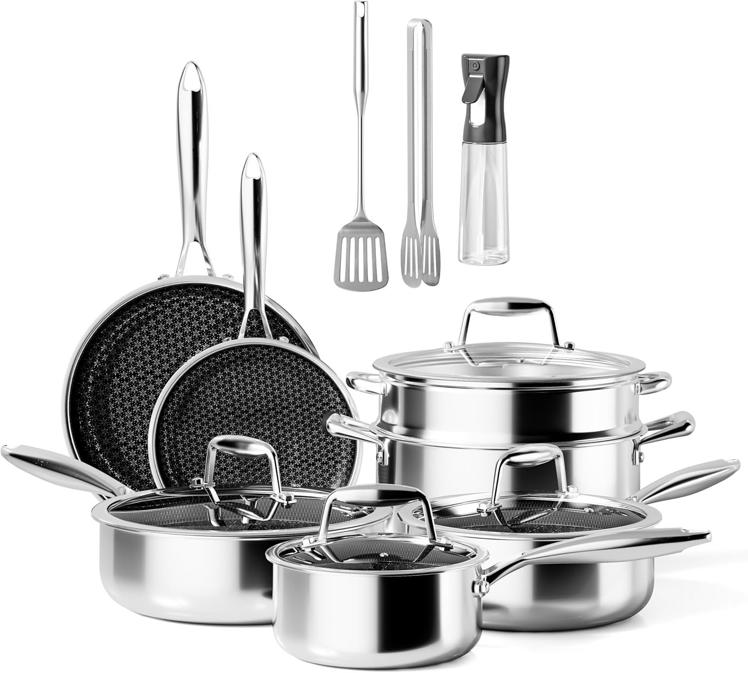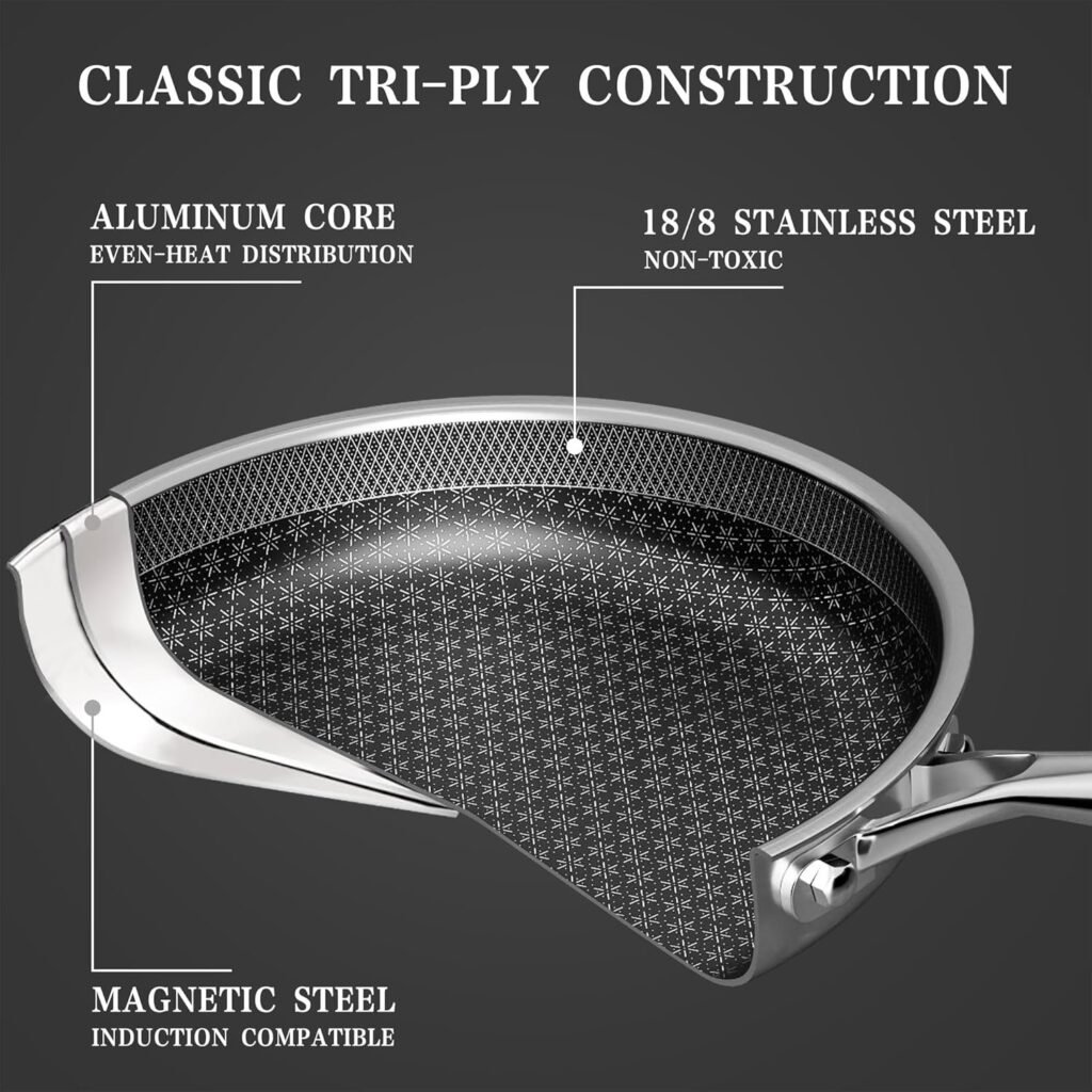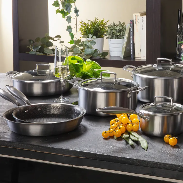 Алуминиевото ядро осигурява равномерно разпределение на топлината, като елиминира горещите точки, докато вътрешният слой от неръждаема стомана 18/8 е напълно нетоксичен и безопасен за здравословно готвене.