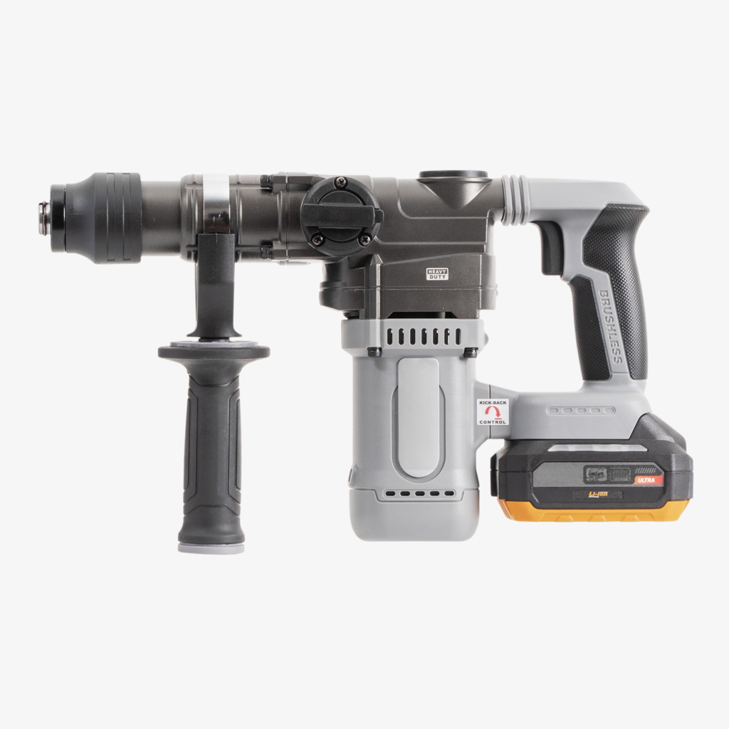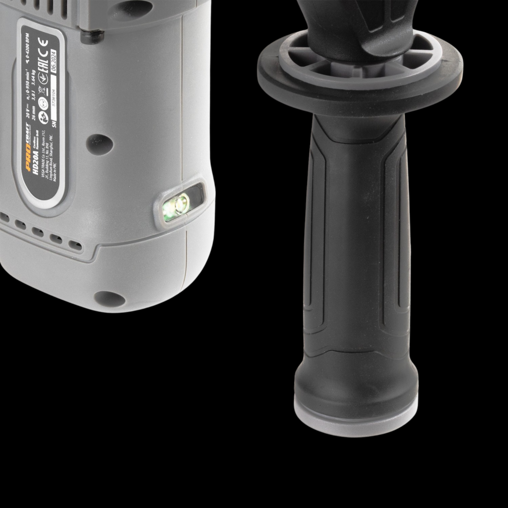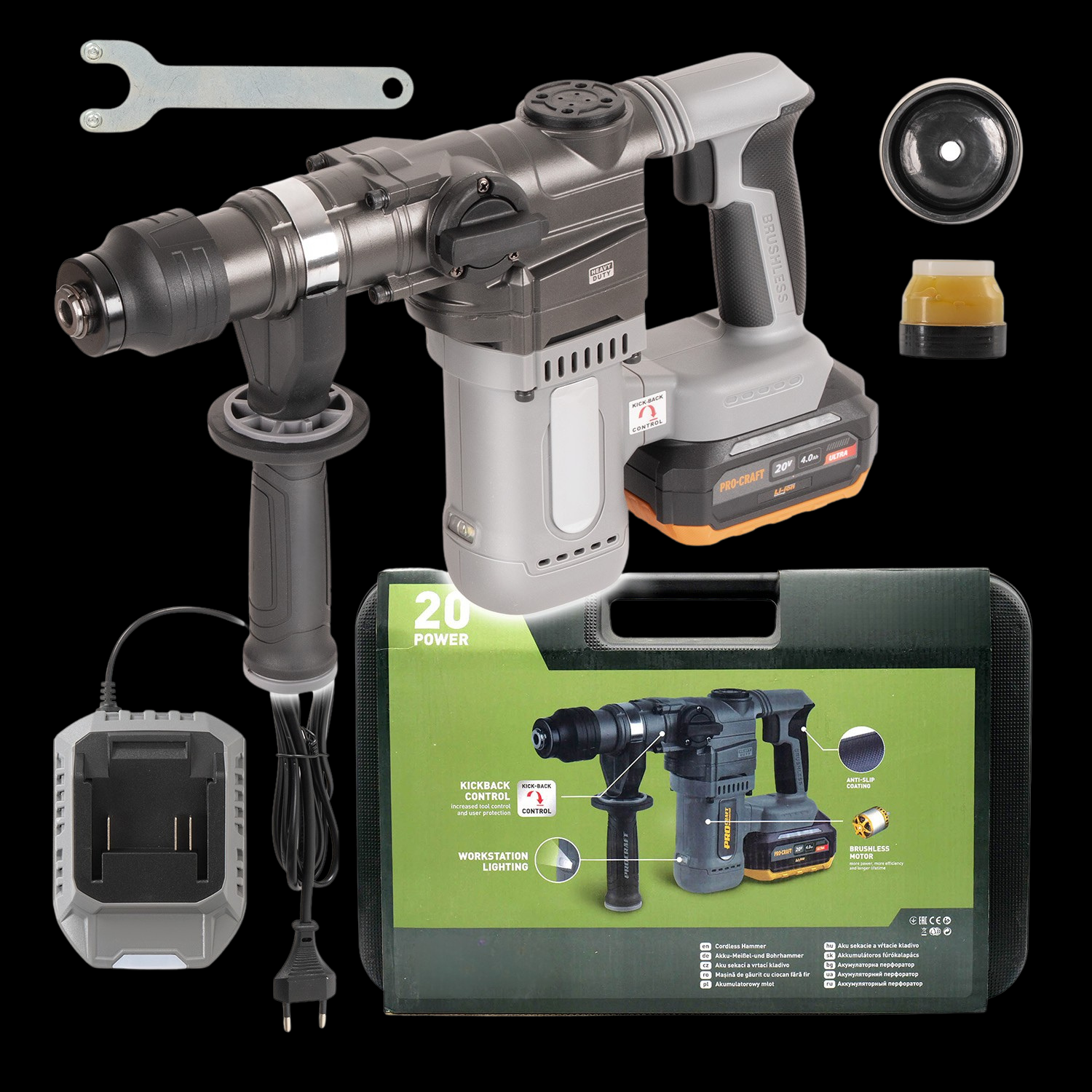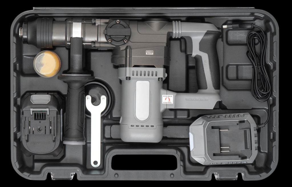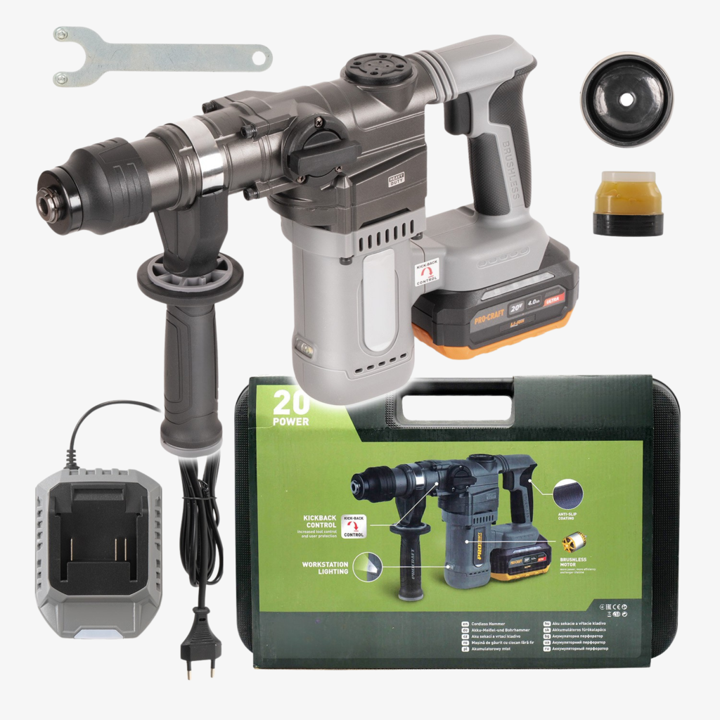 La confezione comprende: batteria 20V 4Ah, caricabatterie 42W, impugnatura supplementare, mandrino SDS Plus, copripolvere, chiave in metallo, lubrificante per manutenzione e una valigetta rigida per trasporto e stoccaggio.